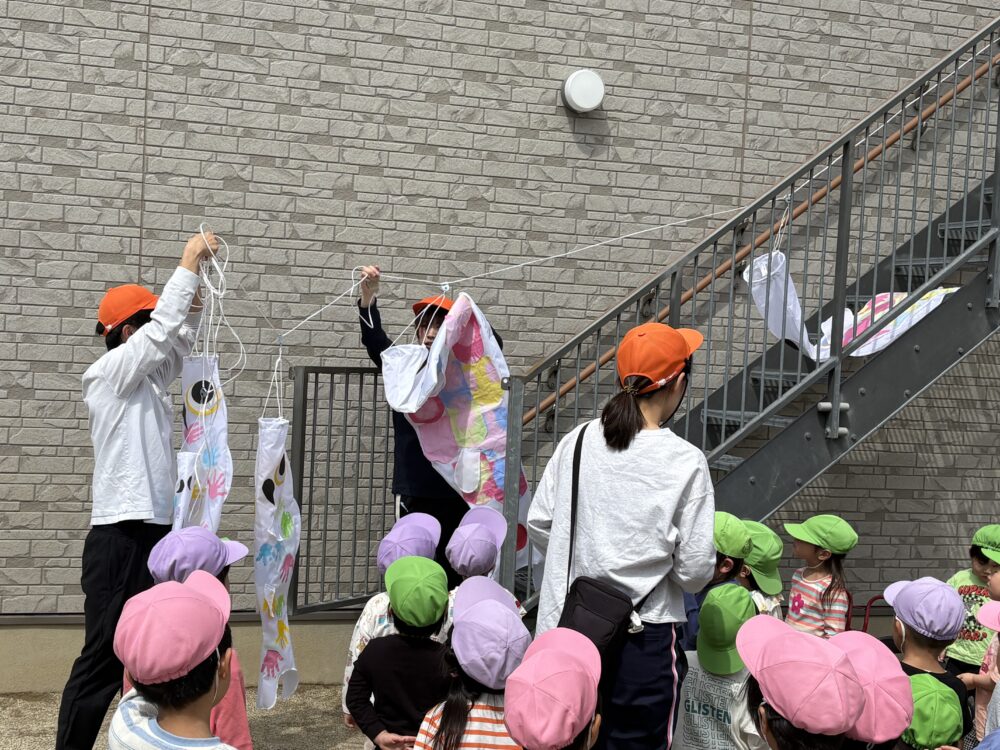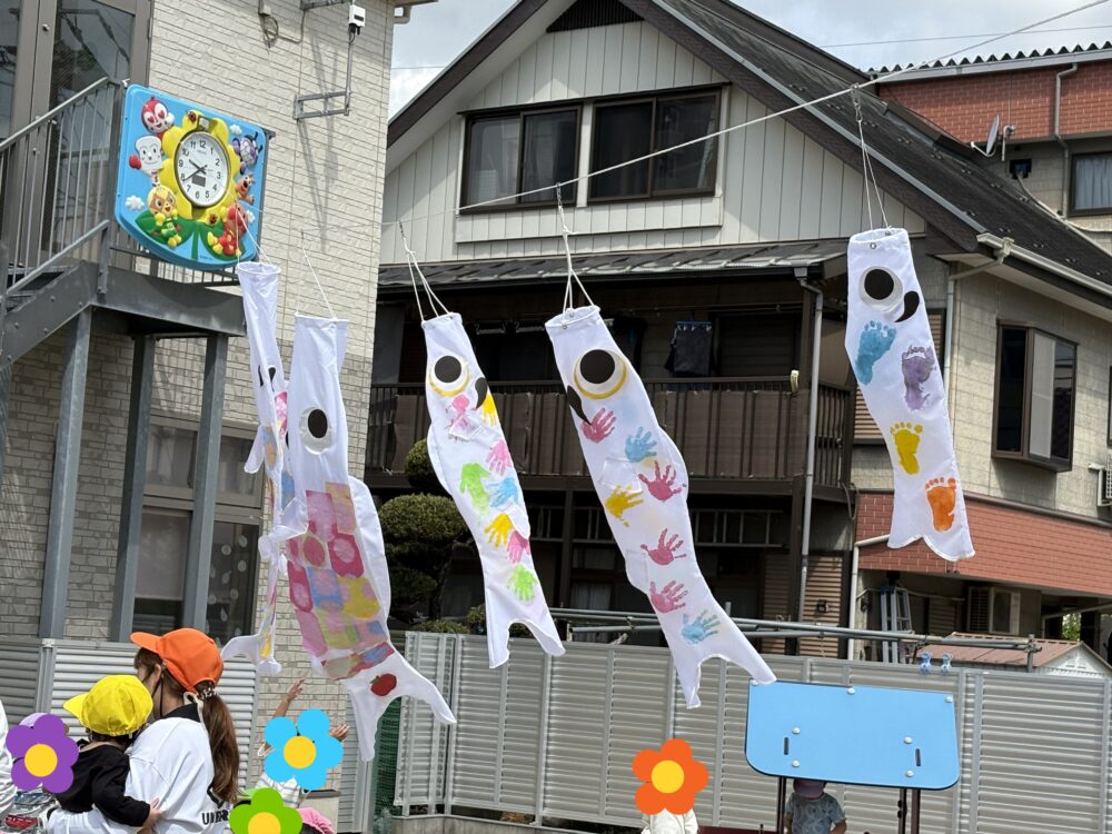 園庭に子ども達が作ったこいのぼり🎏が泳いでいます。