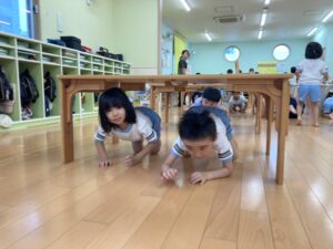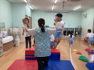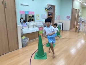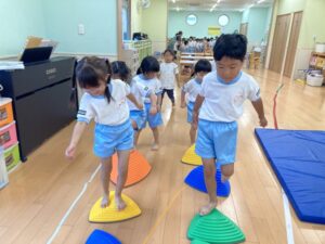 みんと保育園 園の様子 2025.09.22 アスレチック遊び大好き♪ 幼児クラスでアスレチック遊びをしました! バランスストーンの上に乗り、落ちないよう慎重に進んでいきます。 足の裏に力を入れて、力強くステップ台からジャンプ!! コーンにぶつからないように走っていきます。 机トンネル、ネットくぐりと色々な動きにチャレンジ。 大好きなアスレチック!全力で楽しみました♪