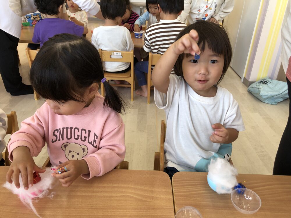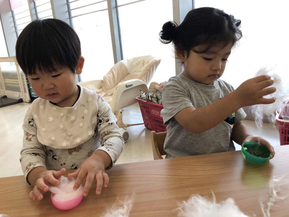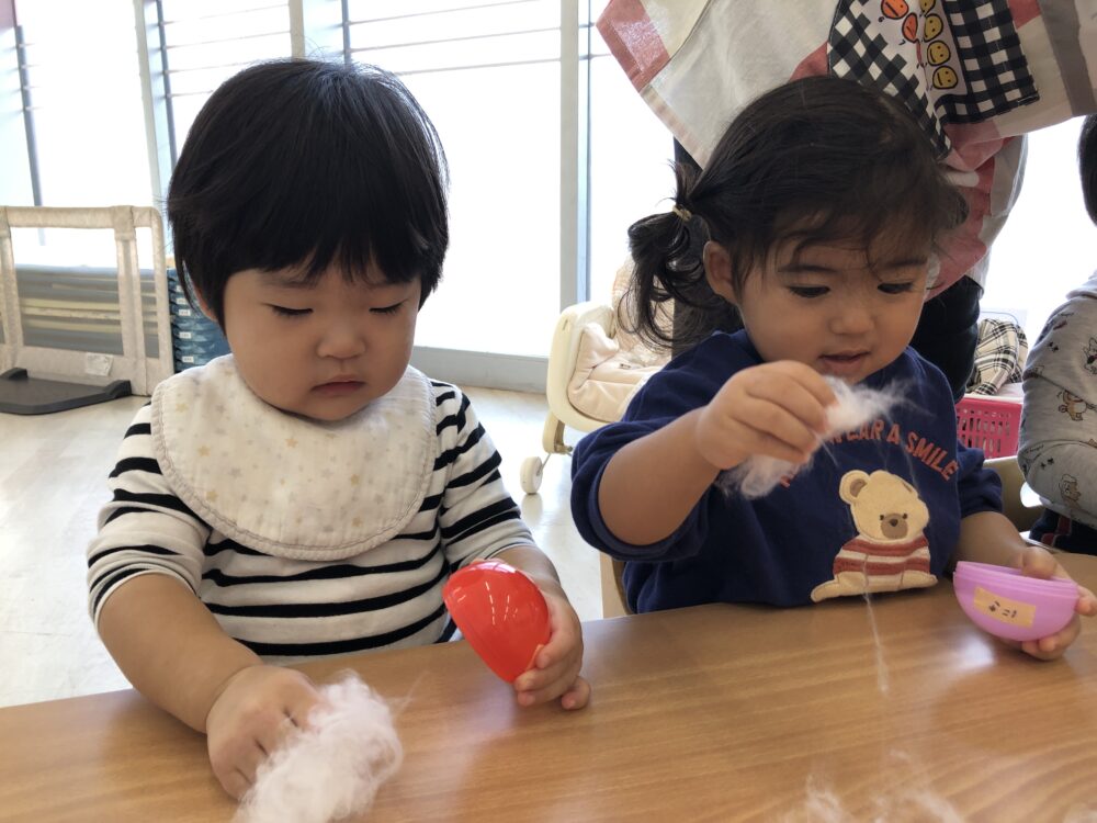 わたを触ると「わー!」「ふわふわ!」と弾んだ声が聞こえてきます!早速カプセルに入れる子や握ったり引っ張ったりして感触を楽しむ子と様々です!