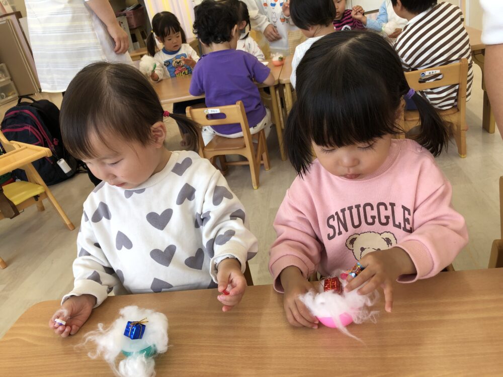 その後わたの上に乗せる入れるビーズやプレゼント、雪だるまなどを「青にする!」「ピンクがいいー!」と好きな色を真剣に選んでいたみんなです♪