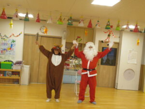 みんなでサンタさんにありがとうの気持ちを込めて各クラス、お歌やダンス、ピアニカで発表を行いました。