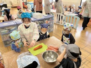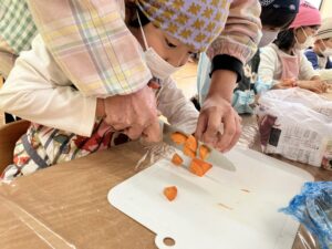 幼児さんはピーラーで皮むきをしたり包丁を持って野菜切りに挑戦!先生と一緒に切ったりとみんな真剣な表情で行っていました。