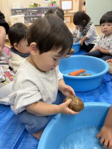 乳児さんはシチューに入れる野菜をゴシゴシ。「きれいになーれ!」と言いながら洗ってくれました🔆