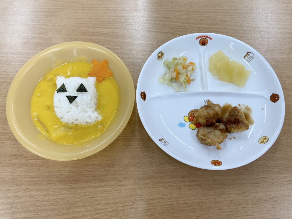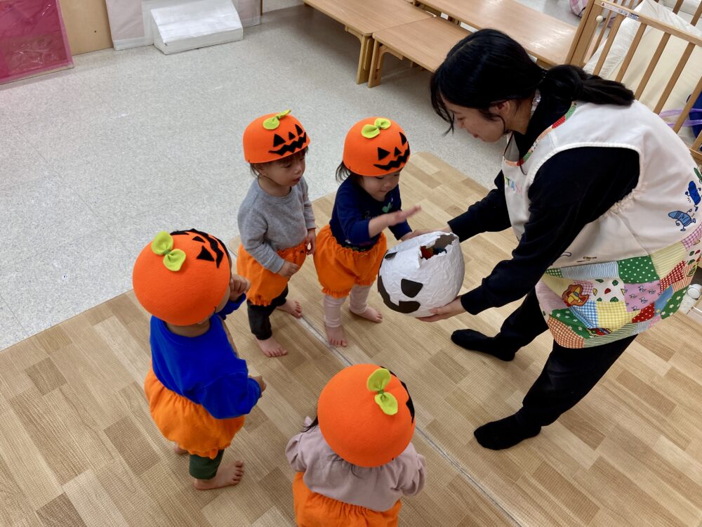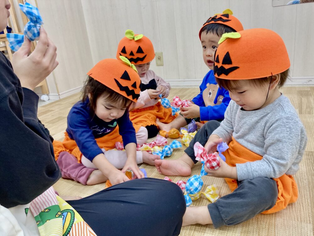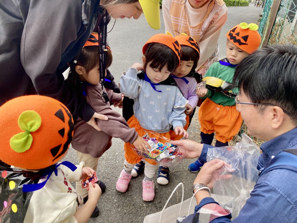 なずな保育園 園の様子 2025.10.31 ハッピーハロウィン🎃 可愛いハロウィン衣装を着て街をお散歩♪ フロンティアキッズの代表がお菓子をくれました! どれにしようかな?? ハロウィンのおばけをやっつけよう👻のゲームをしました! 中にはキャンディ🍬 給食はおばけライスでした!! 子どもたちは「おばけ~」と大喜びでおかわりをたくさんしていましたよ♪