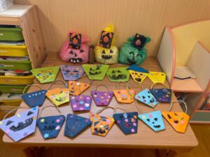つばき保育園 園の様子 2025.10.31 ハロウィン散歩 今日は、ハロウィンの日で給食は自分たちでトッピングし 皆ニコニコ笑顔でほとんど完食でした。 地域の方からは、ご厚意で子どもたち一人ひとりにお菓子をいただき 「トリックオアトリート」と元気な声が飛びかっていました。 お菓子を入れるバックもこの日のために頑張って製作し 楽しい一日になったつばき保育園の子どもたちでした。