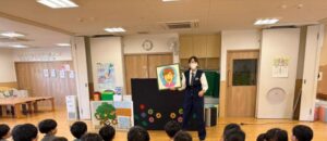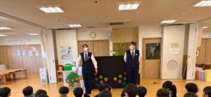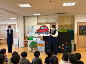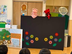 子どもたちは、ペープサートや人形劇を通して気を付けることを伝えていただき