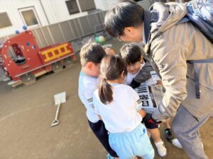 湯地代表と一緒にたいよう組の子どもたちが砂場を作る様子を見たり、