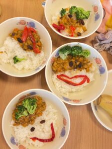給食は「鬼のドライカレー」パプリカ、レーズン、ブロッコリーでトッピング。