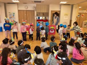 節分の由来や食べ物についてのお話を聞き、節分クイズではみんな元気よく手を上げていました。