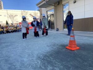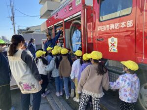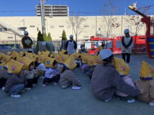 みんと保育園 園の様子 2025.12.01 通報避難訓練をしました 通報避難訓練を行いました。 大地震を想定して頭を守り、避難経路を確保し、室内で避難。 その後、調理室から火災発生を想定し、初期消火、119番通報をし、園庭に避難しました。 消防署の方が来てくださり、避難訓練の様子を見て、講評をして頂きました。 そのあとは、保育者の水消火器の訓練を見たり、 消防車の前で写真を撮ったりしました。 冬は空気が乾燥したり、暖房器具を使うことにより、火災が起こりやすい季節です。 万が一の事態に備え、しっかり日頃から対策を取っておくようにしましょう。