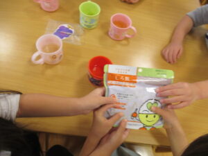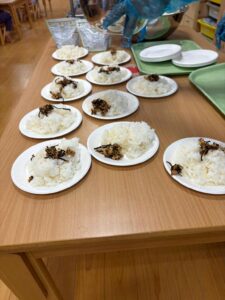 午後は、備蓄の食料のアルファ米や備蓄水を使い紙皿、紙スプーンを使っておやつの