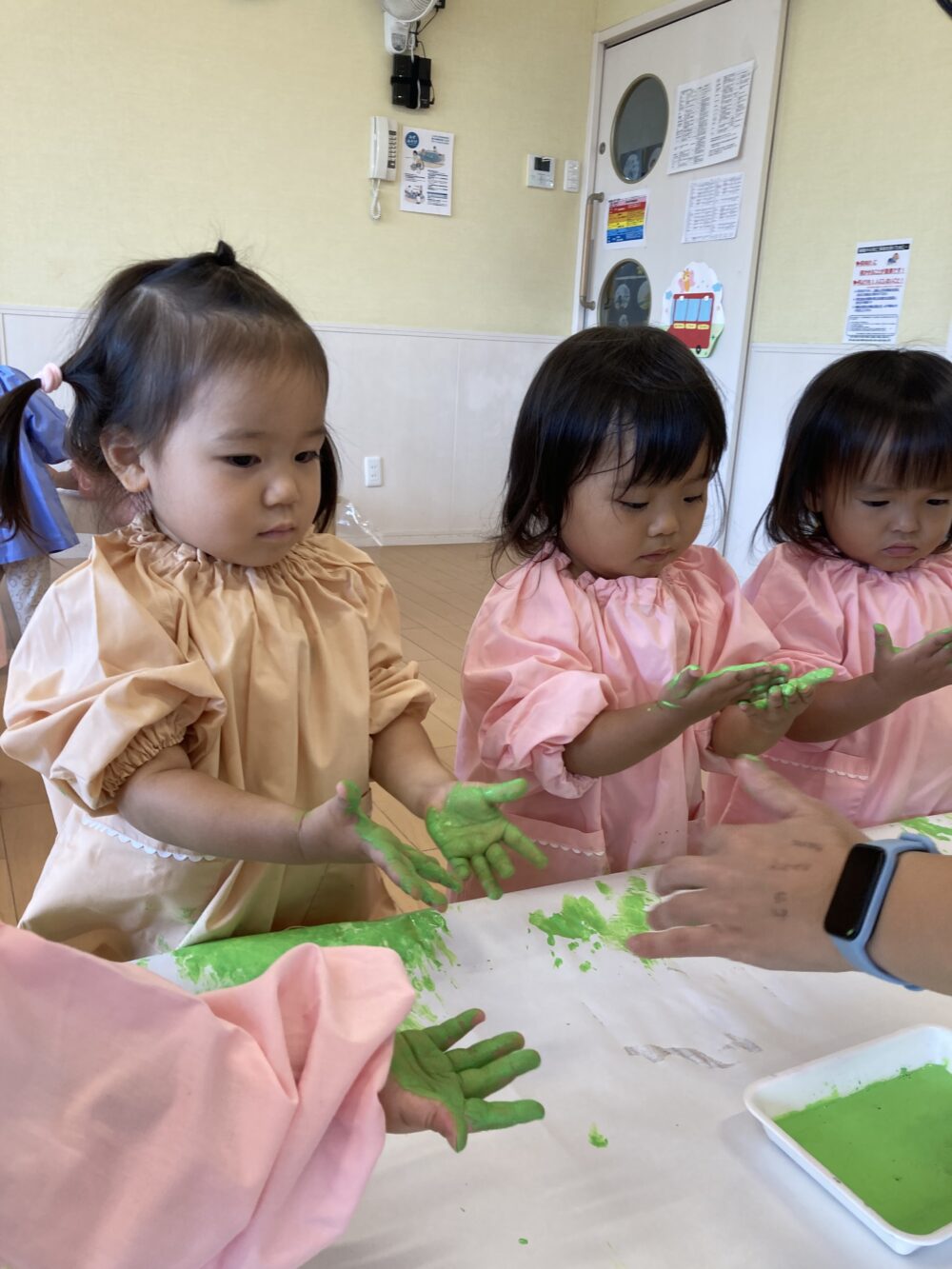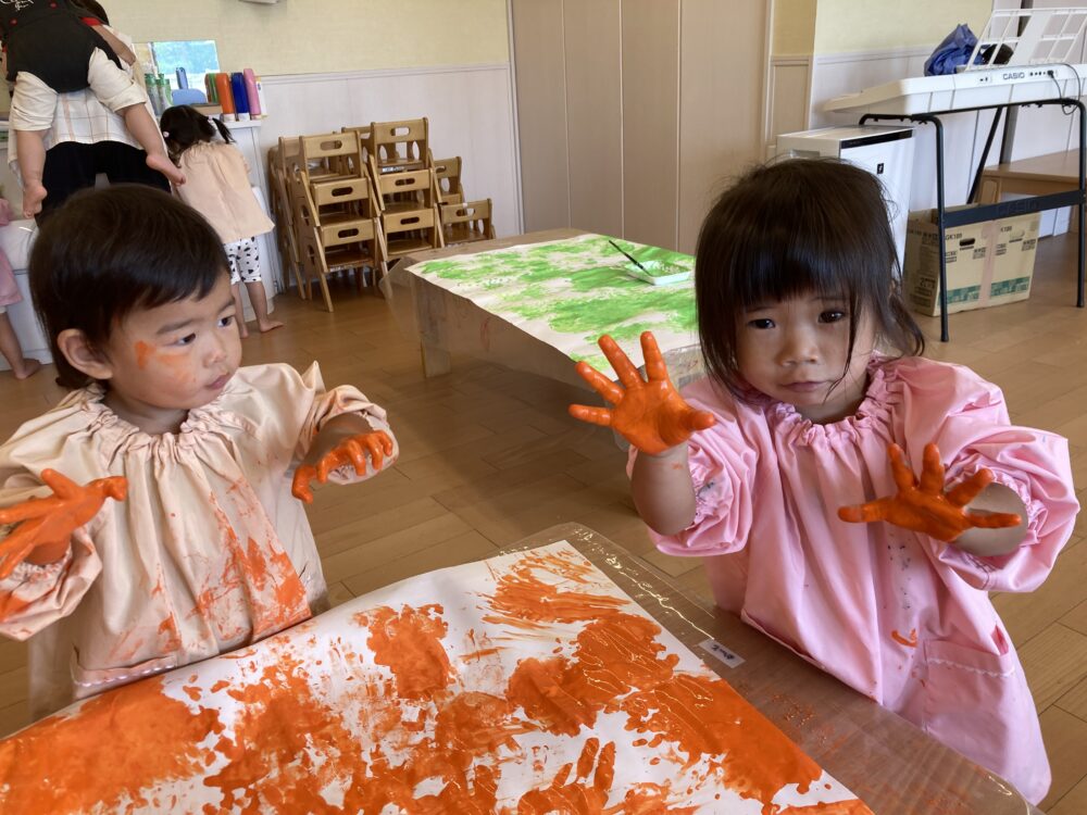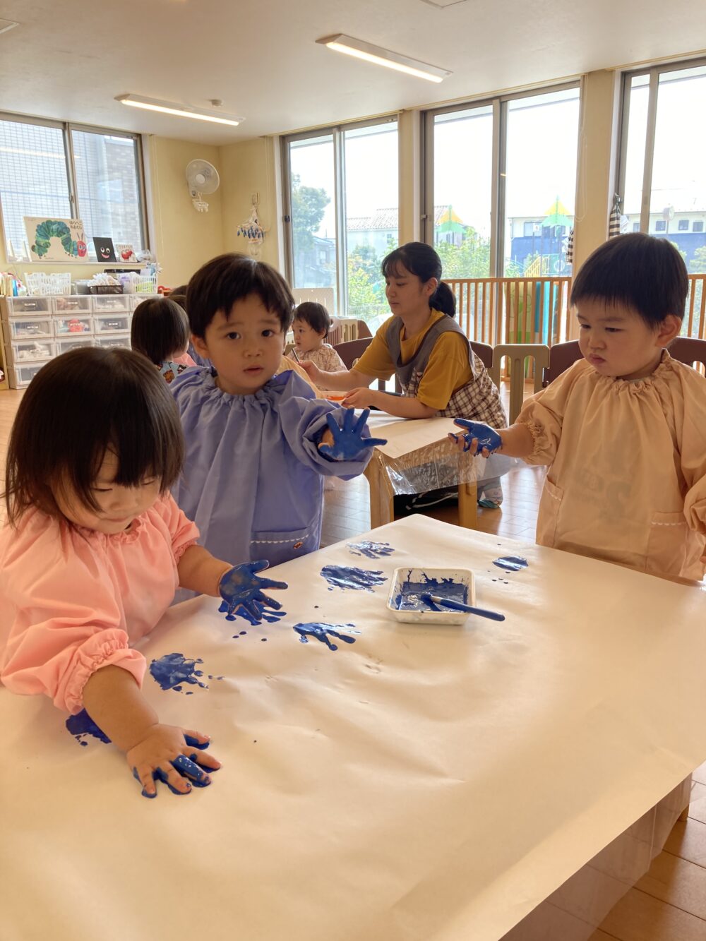 友だち同士で絵の具だらけの手を見せ合ったり、保育者と話しながら思い思いにペタペタ!楽しそうな声が響いていました。