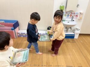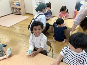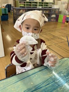 乳児さんは「これぎょうざ?」といつも見る見た目とは違うものに最初は不思議そうに見ていた子どもたちも叩いてみたり揉んでみたりして感触を楽しみながら行っていました。
