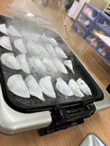 最後の皮に餃子の餡を包む工程は少し難しかった子もいたようですが、最後まで自分でやってみると頑張る姿が見られました。