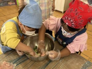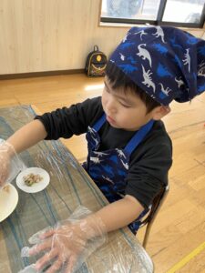 最後の皮に餃子の餡を包む工程は少し難しかった子もいたようですが、最後まで自分でやってみると頑張る姿が見られました。