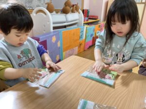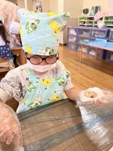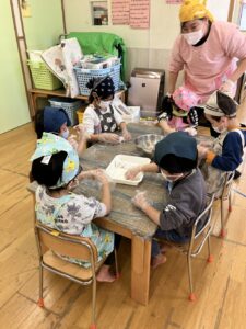 乳児さんは「これぎょうざ?」といつも見る見た目とは違うものに最初は不思議そうに見ていた子どもたちも叩いてみたり揉んでみたりして感触を楽しみながら行っていました。