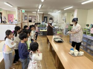 幼児さんはエプロンに着替え、やる気いっぱいで作り方の説明をよく聞いて取り組んでいました。