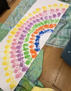 各クラスカラーの絵の具を使って、手形を行い、大きな虹を作りました♪