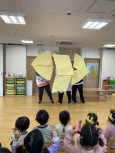 つばき保育園 園の様子 2026.04.24 4月の誕生会を行いました 今日は、今年度初めての誕生会を行いました。 4月は18人のお友だちのお祝いをしました。 緊張した表情のお友だちや、進級して堂々とお名前も大きな声で 言えたりと成長を感じることができました。。 担当の保育士からは、「タングラムシアター」で葉っぱや キツネ、魚に変身したシアターを楽しみました。 4月生まれのお友だちおめでとうございます。